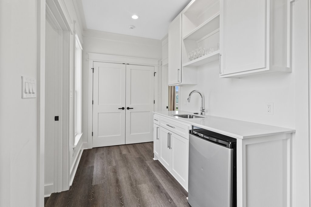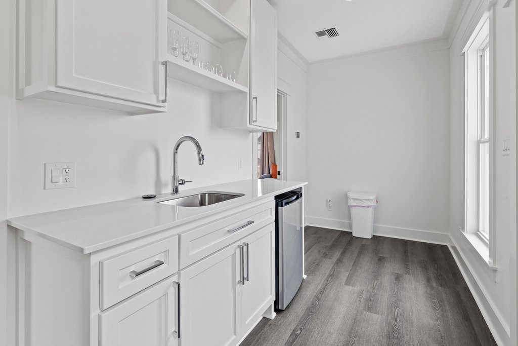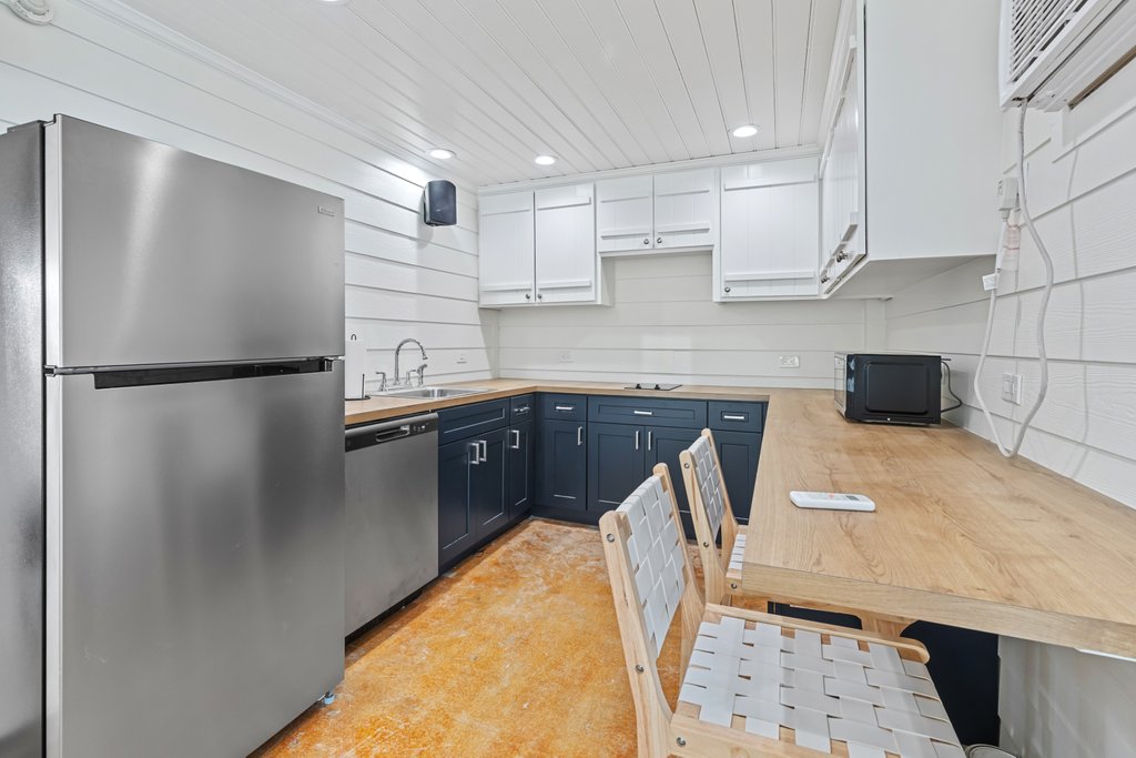 - The second kitchen has a refrigerator, sink, dishwasher, and stovetop.